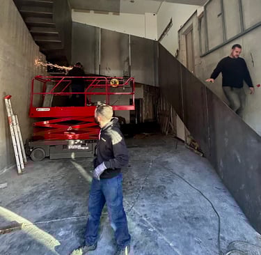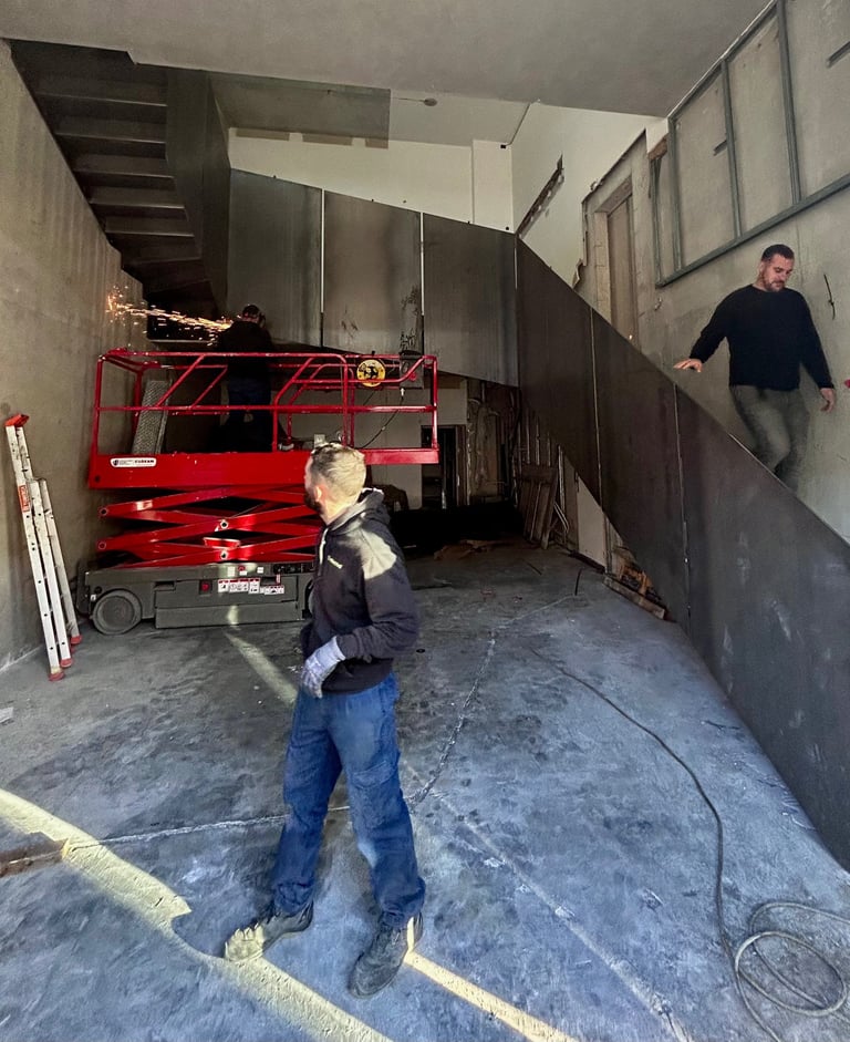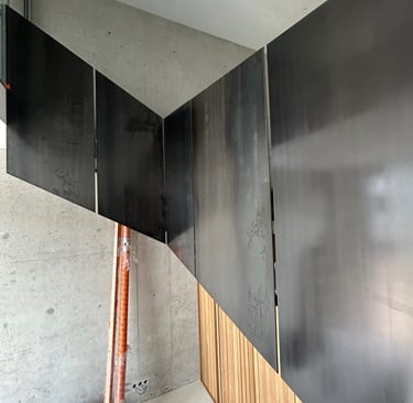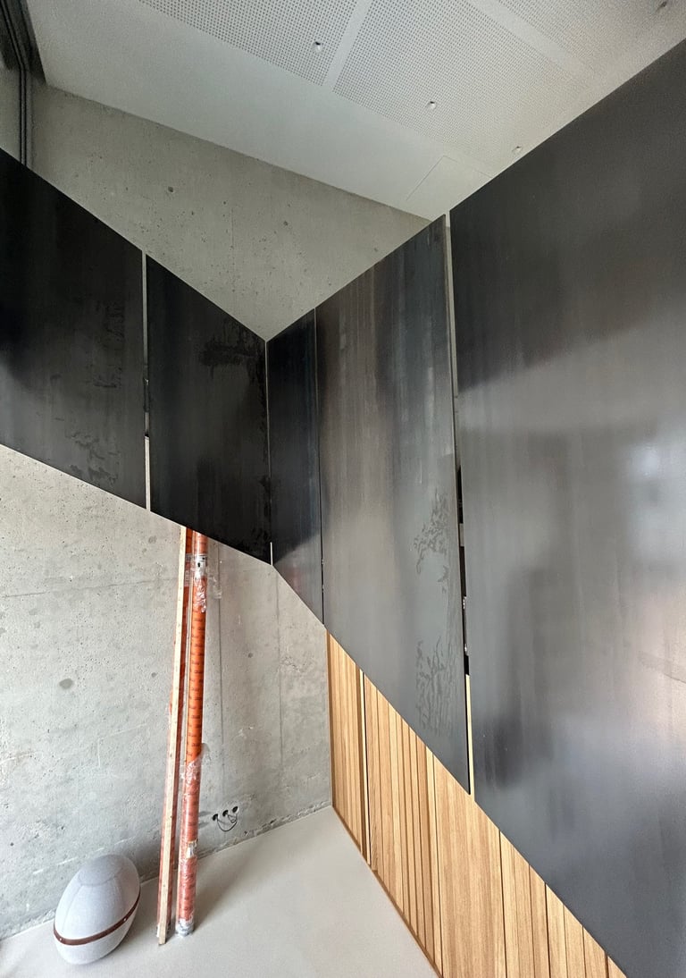 Ce travail de finition a permis d’enrichir l’ouvrage d’une teinte profonde et nuancée, mettant en valeur la texture naturelle de l’acier tout en affirmant son caractère brut et authentique.