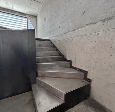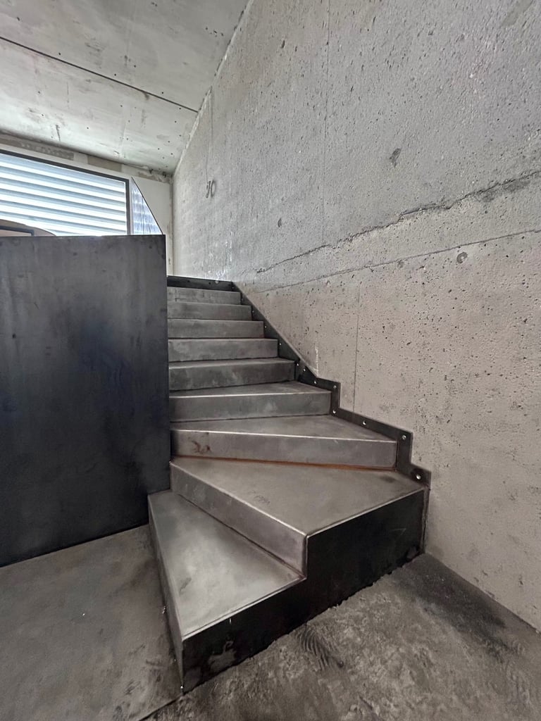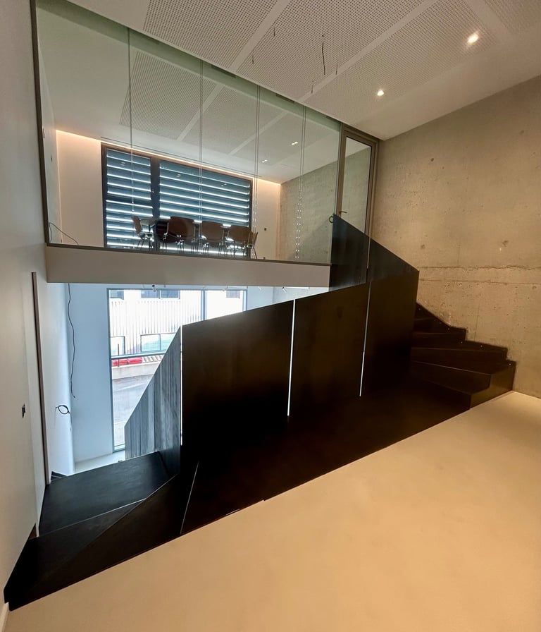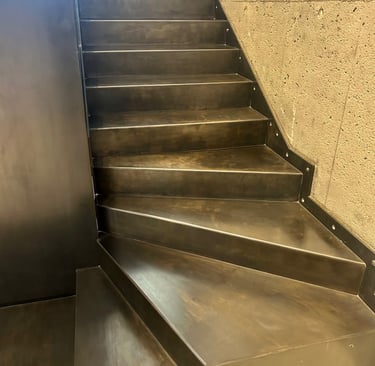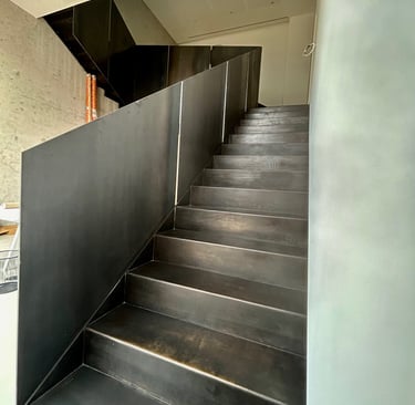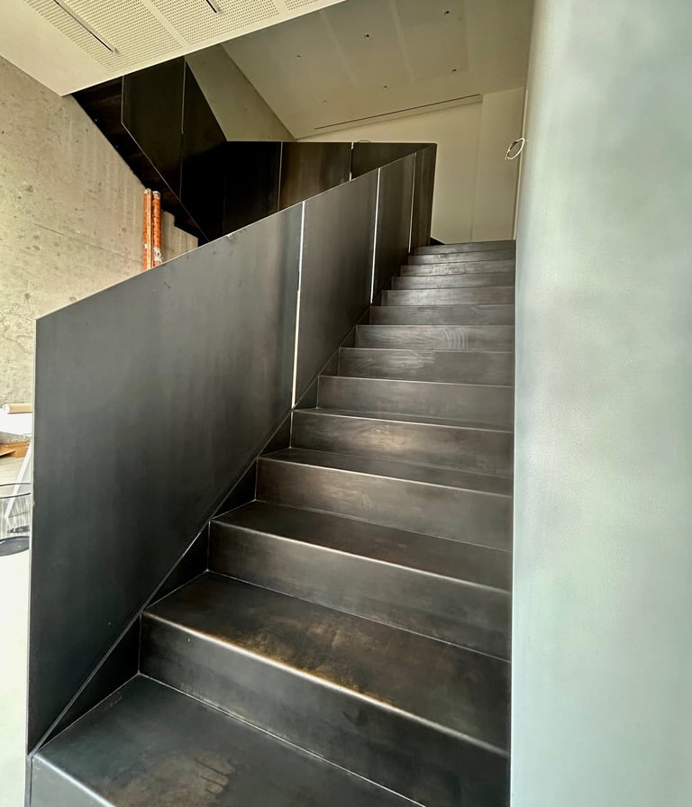 Dans les bureaux de Mawa, à La Seyne-sur-Mer, une patine canon de fusil a été réalisée sur un escalier.