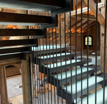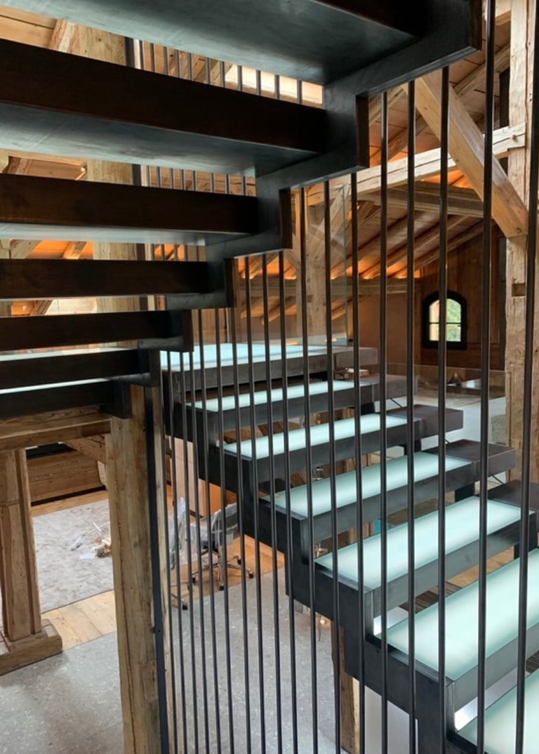 Sa structure autoportante en acier patiné canon de fusil a été réalisée avec le savoir-faire de Prémices, qui a apporté à l’ensemble une finition soignée et intemporelle. Les marches caisson en verre lumineux apportent une touche discrète de modernité et de légèreté.